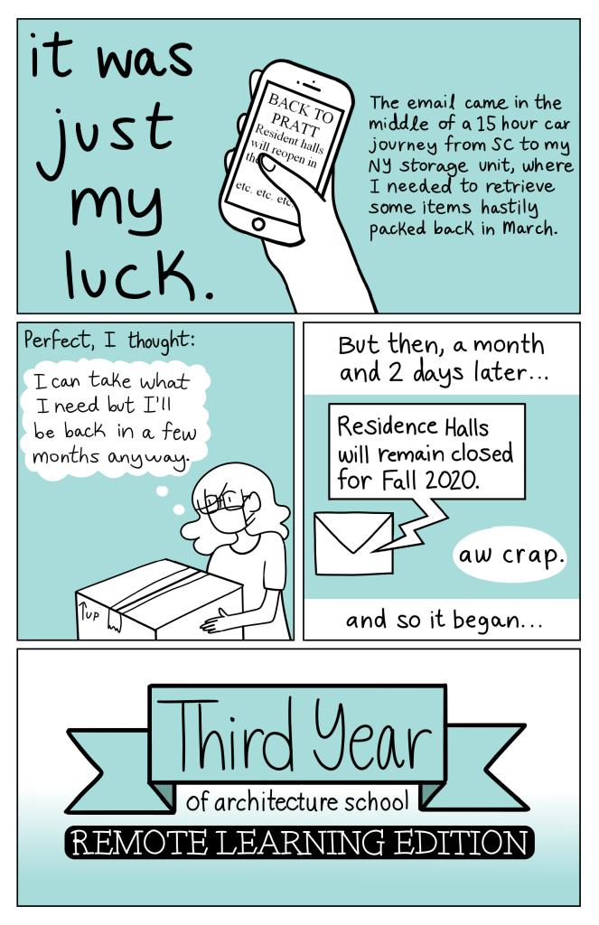 Hello once again! This is a lil comic to encapsulate my third year of architecture school. It’s optional but if you’d like to read in order, here is my 2020 Second Year of Architecture School zine, 2019 First Year of Architecture School zine, and prior to that I tested the waters with my 2018 Senior Year (of high school) zine.