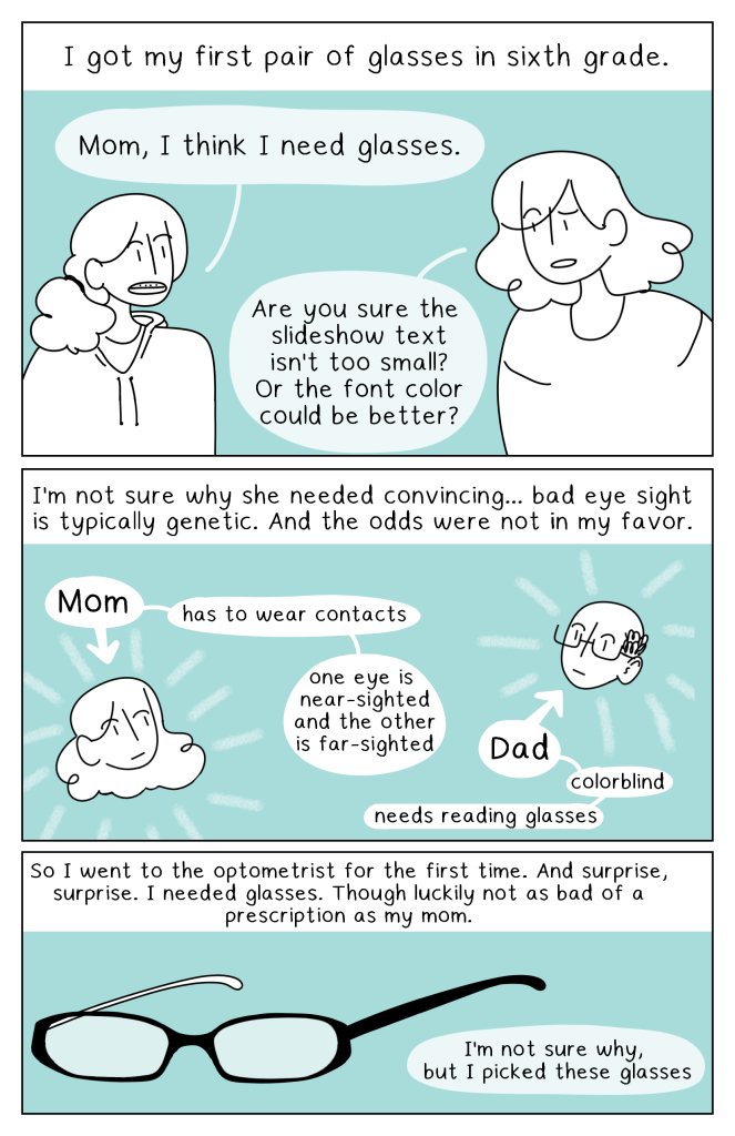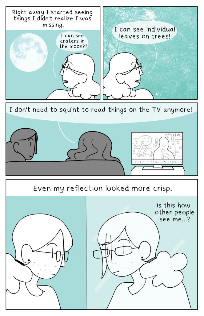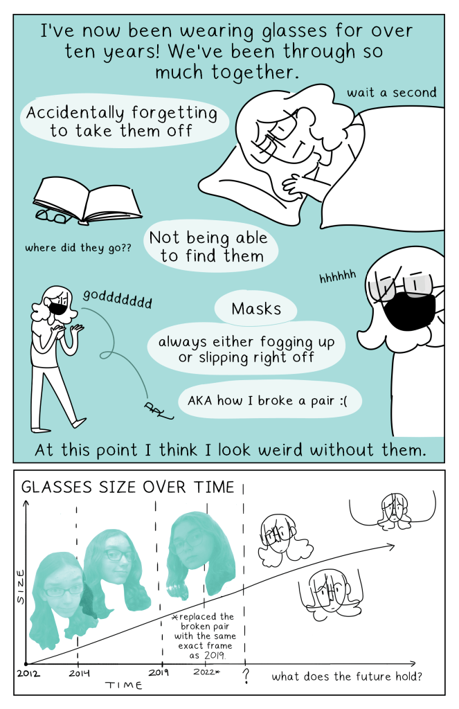 Here’s the comic that is in Static Fish Fall 2022 (the anthology of Pratt’s Comic Club of which I am a president this year). The theme was perception so I made a lil comic about wearing glasses.