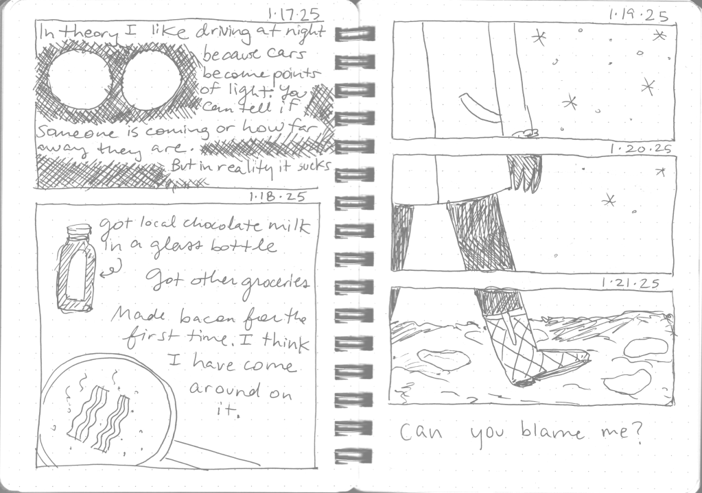 At the end of December, I came across Sophie Yanow’s gentle comic habit via Lisa Hanawalt and figured I would give it a shot. It would bring me back to drawing everyday with a bit of a different structure. I wouldn’t necessarily be documenting what I did each day, and I wanted to draw on paper instead. I altered the rule to add a minute everyday you draw (which would end the year with drawing for 6 hours if you were rigidly sticking true to form) to be instead “the day of the month= how many minutes to spend drawing”. I was largely drawing during my lunch break and I didn’t want to ever go over 31 minutes. And speaking of time limit, I decided later in the month that the minutes would moreso be a cap than a strict “must draw for all twenty-plus minutes”- if I have a quick idea, I am not gonna stretch it out. Which might be against the point, but at least for now, I care more about doing something consistently than building a ton of stamina.